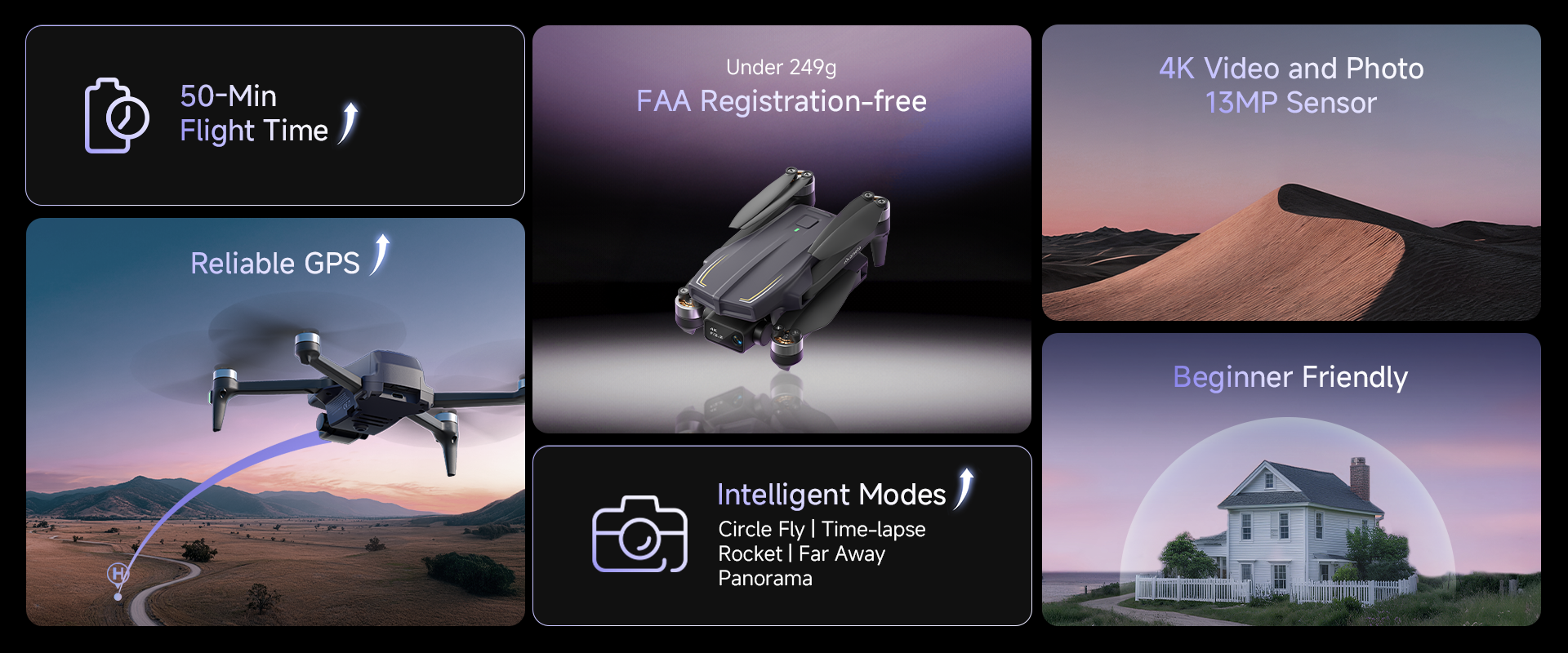 With One Key Takeoff, Altitude Hold, GPS Auto RTH, and Beginner Mode, flying feels safe, simple, and smooth—from your very first flight.